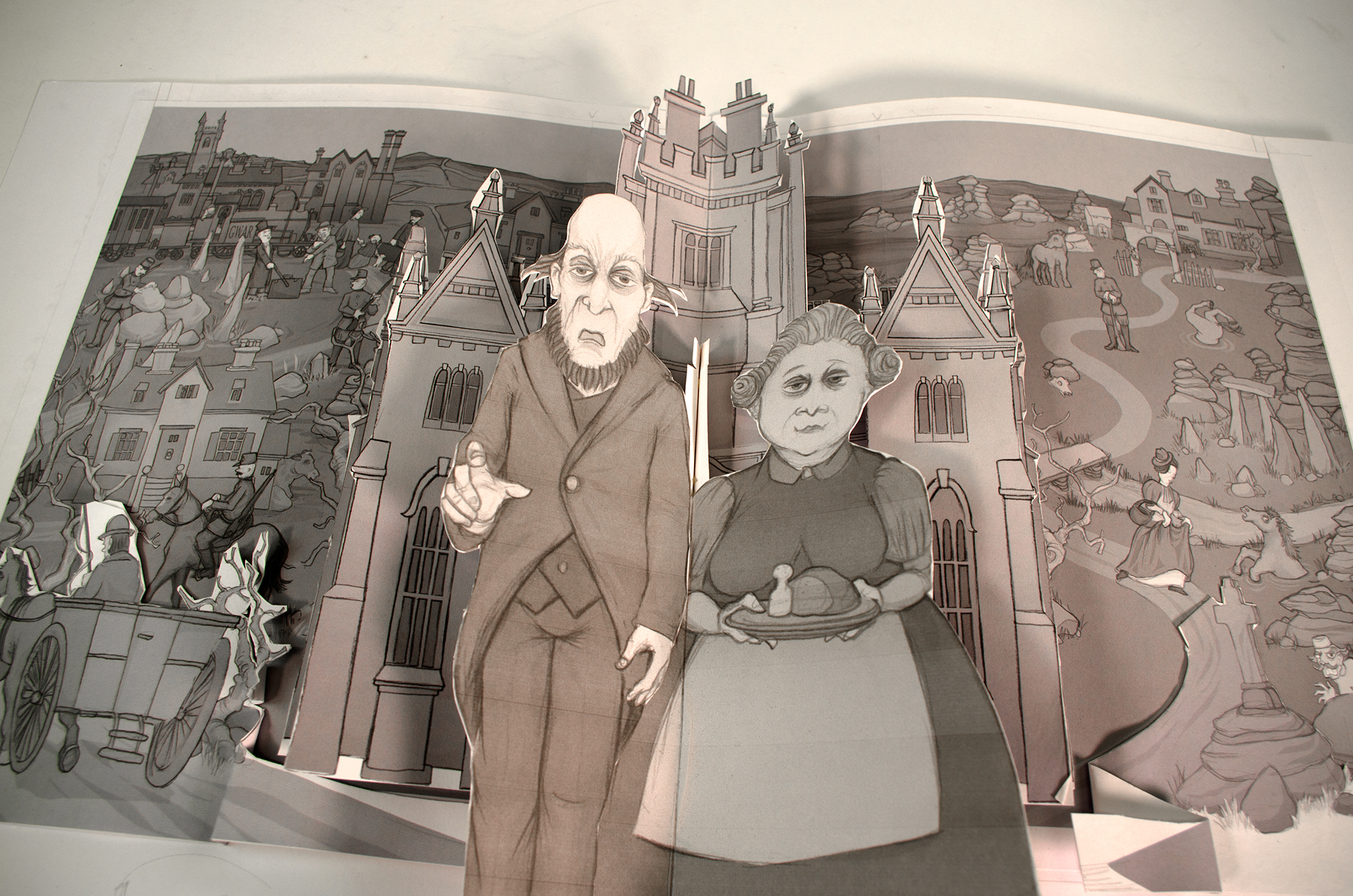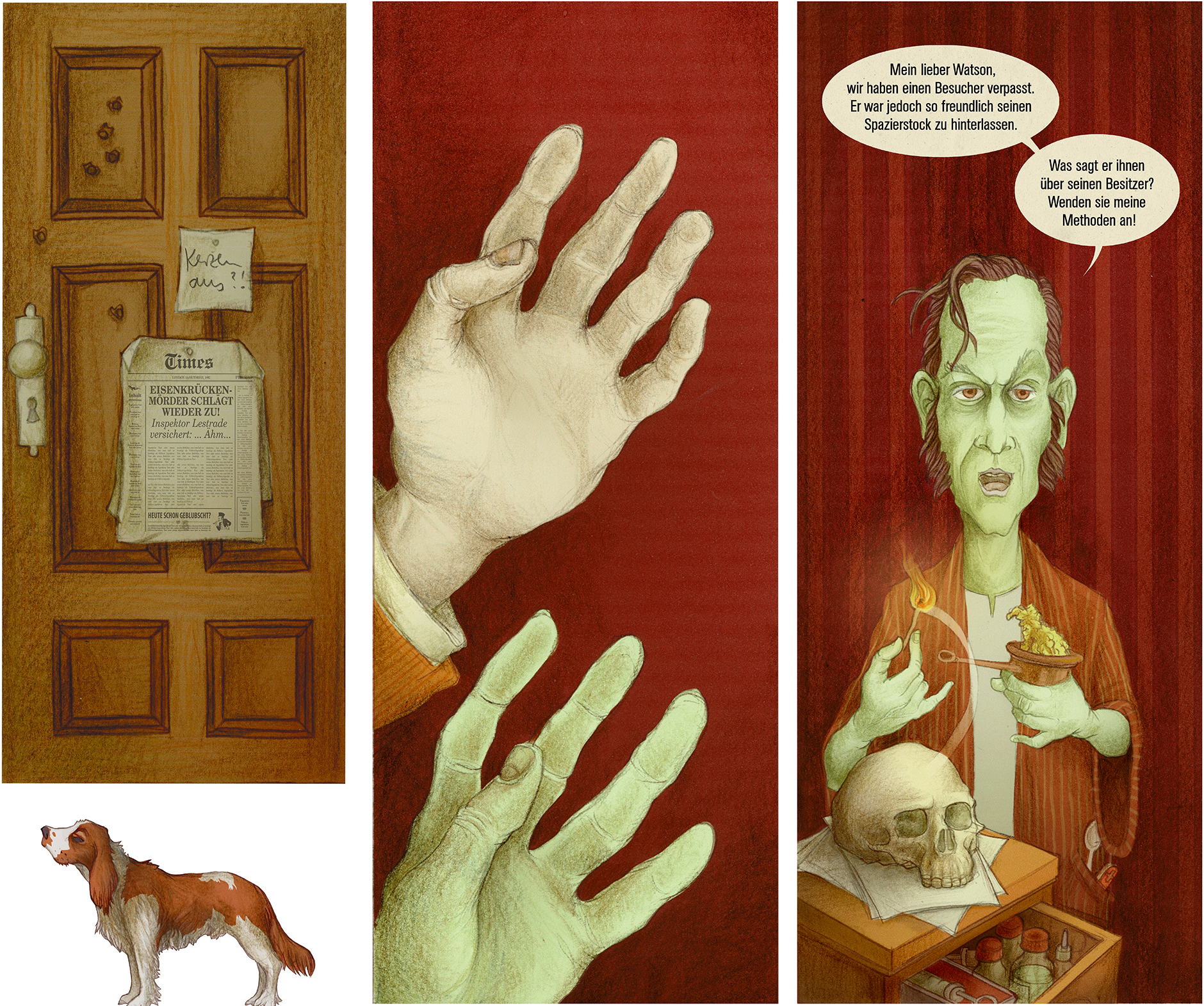 Die klassische Sherlock Holmes Geschichte „Der Hund von Baskerville“ als Comic Pop-up Buch. Die Idee war die Elemente eines Pop-Up Buches in den Dienst einer Comicerzählung zu stellen. Ein Bildelement nach dem anderen wird aufgeklappt, herausgezogen. Eine Tür wird geöffnet, dahinter kommt ein Mann zum Vorschein und sagt etwas. Dafür habe ich mit einer Papierdesignerin zusammengearbeitet.