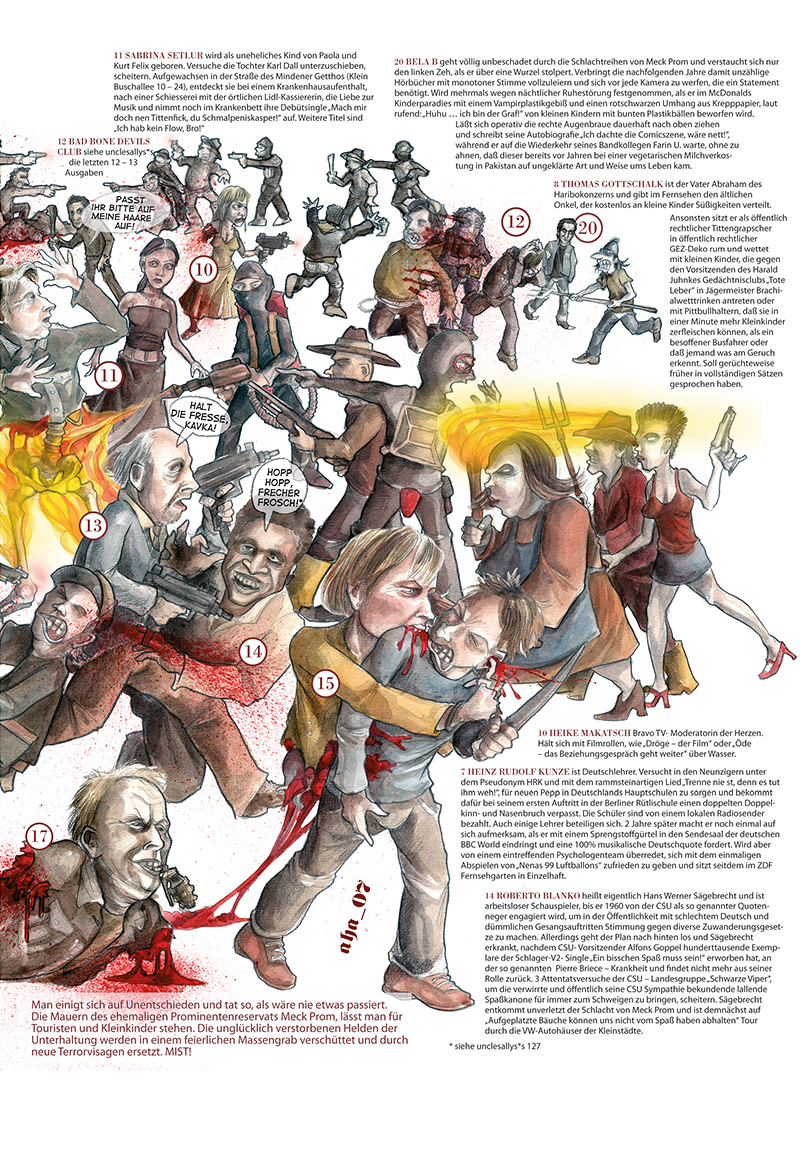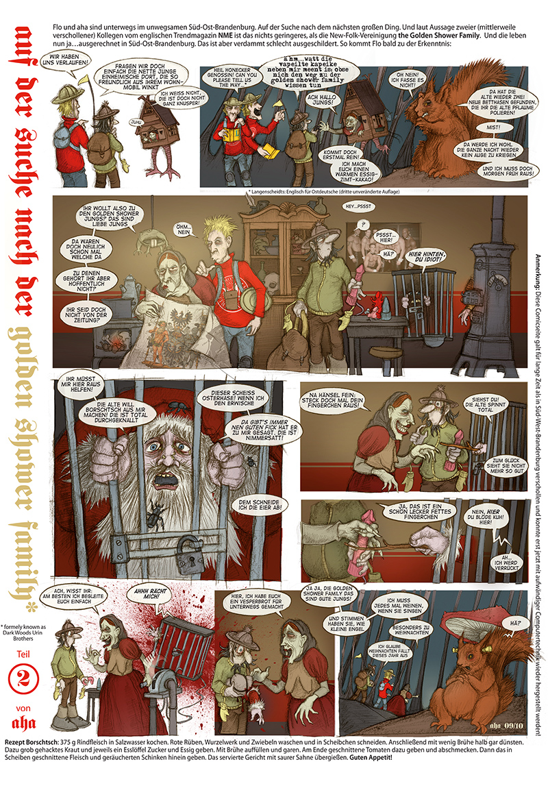 Ab dann wurde es richtig gut! Die Figuren erlebten wilde Abenteuergeschichten. Viele mich weiterhin begleitende Figuren wie der Wal auf mechanischen Beinen und der Teufel im Anzug sind in diesem Rahmen entstanden. Irgendwann ging die Musikindustrie kaputt oder das Internet kam oder es war Wirtschaftskrise oder alle waren bei Napster. Ich weiß es nicht mehr. Aber niemand hat mehr Anzeigen gebucht und das Heft wurde eingestellt. Ich hätte noch eine Ausgabe länger gebraucht, um meine gerade laufende Storyline abzuschließen. (Das war meine größte Niederlage in meinem Leben.)